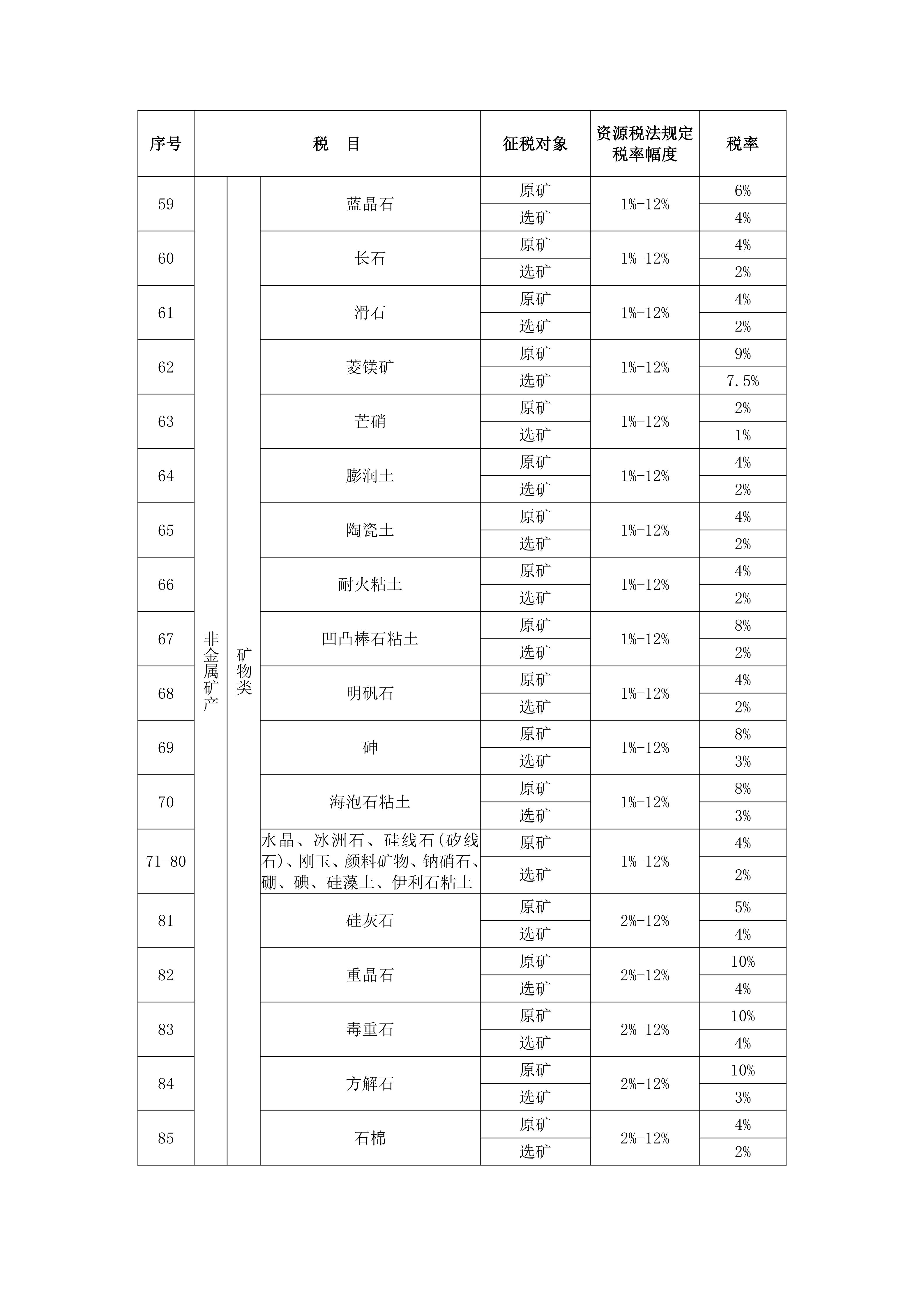 (一)将我省应税税目由51个扩展到我省所有已发现的矿产资源税目和氦气共计131个,并对税率予以调整明确。一是优势资源税率适当调整,主要涉及镍、铅、锌、金、铁、铜等12种,其中凹凸棒石粘土的选矿税率适当下调,支持其开发应用向纵深开展。二是稀缺和战略资源税率按法定税率幅度的较高档确定,主要涉及钴、铂族金属、铬等41种查明资源量居全国前5位或属于战略性矿产、稀散金属的税目税率,其中对锑的税率在2024年基础上再次调整。三是其他39种已发现且尚未开采的资源税率按法定税率幅度的中低档确定,激励开展进一步的地质勘查勘探。另外,对已勘察发现但资源量未查明、未纳入我省矿产资源年报统计范围的氦气,适用税率一并予以明确。四是原矿税率从高确定,推动产业链向下游高附加值环节延伸。