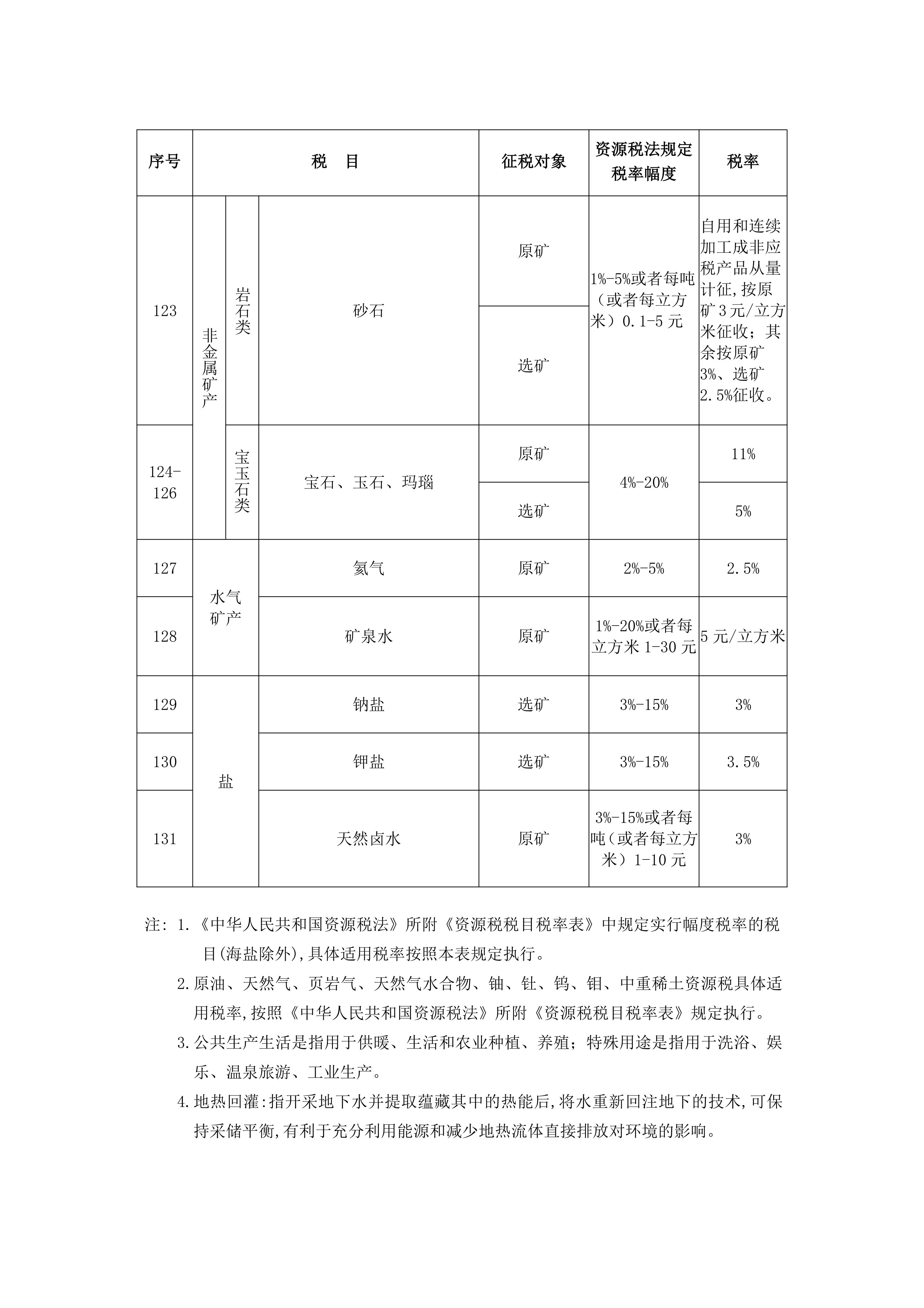 2020年9月1日,《中华人民共和国资源税法》颁布施行,对155项应税资源的税目税率、6个税目采取从价计征或从量计征,以及部分免征或减征情形,授权地方决定,具体由省级人民政府提出,报同级人大常委会决定,并报全国人大常委会和国务院备案。据此,我省确定了煤、镍、金等51个已开采矿产资源税目的税率,未明确的按最低税率征收;6个税目计征方式选择上,地热从量计征,矿泉水、天然卤水从价计征,石灰岩、其他粘土、砂石从量和从价相结合计征。同时,对纳税人遭受重大损失和开采伴生矿、低品位矿、尾矿作出减征或免征的规定。