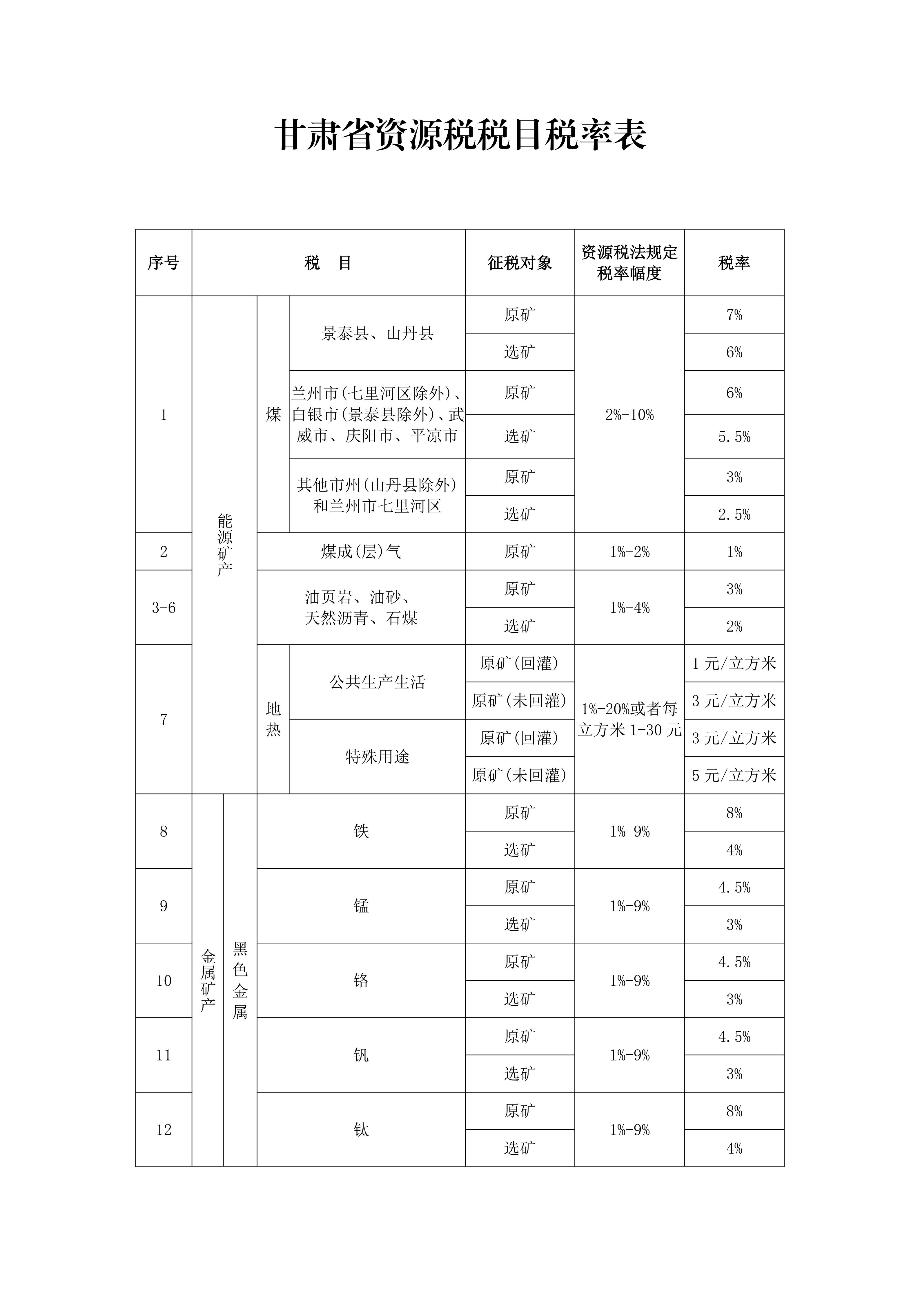 一、《中华人民共和国资源税法》第二条规定实行幅度税率的“金”“镍”等资源税税目,具体适用税率按本决定所附《甘肃省资源税税目税率表》执行。